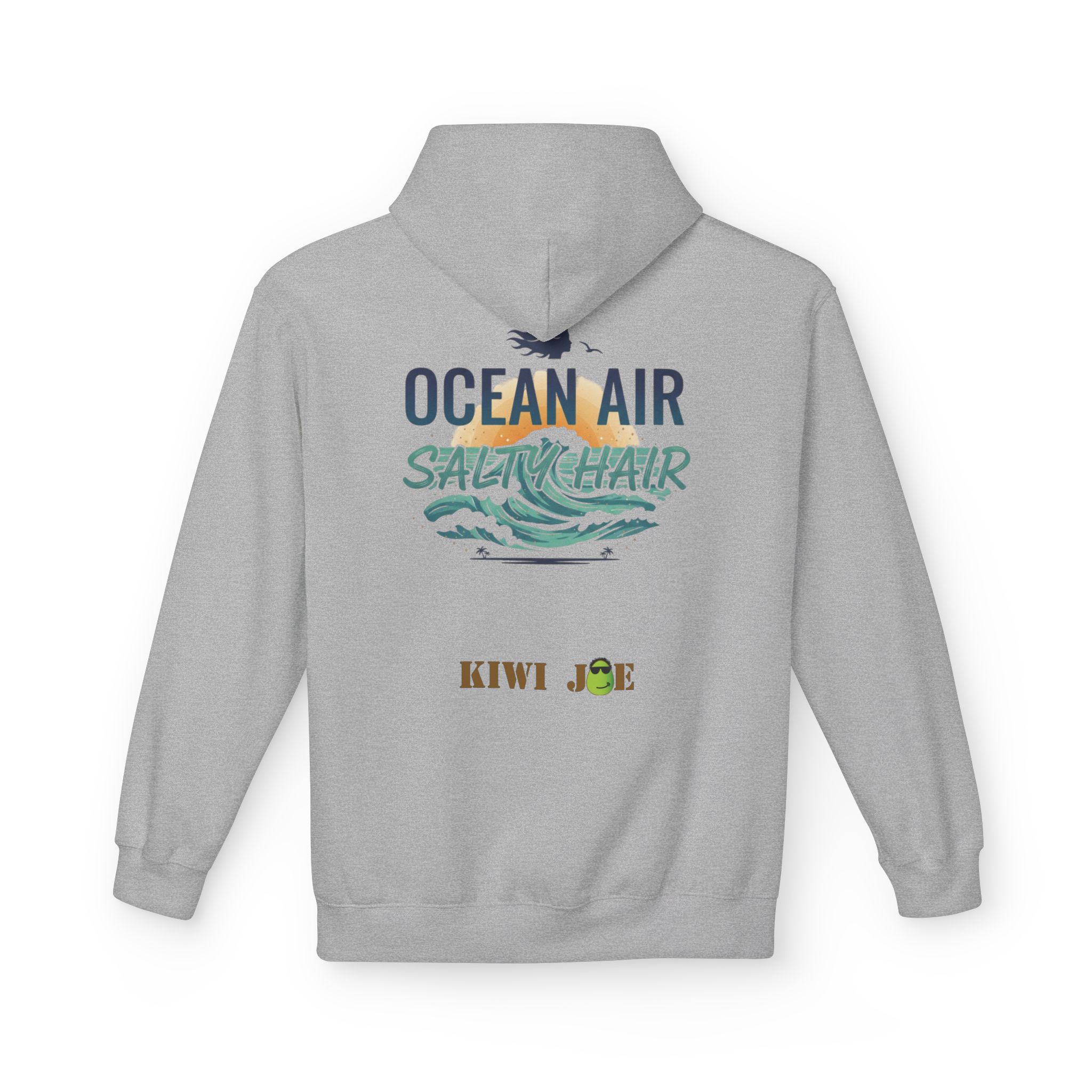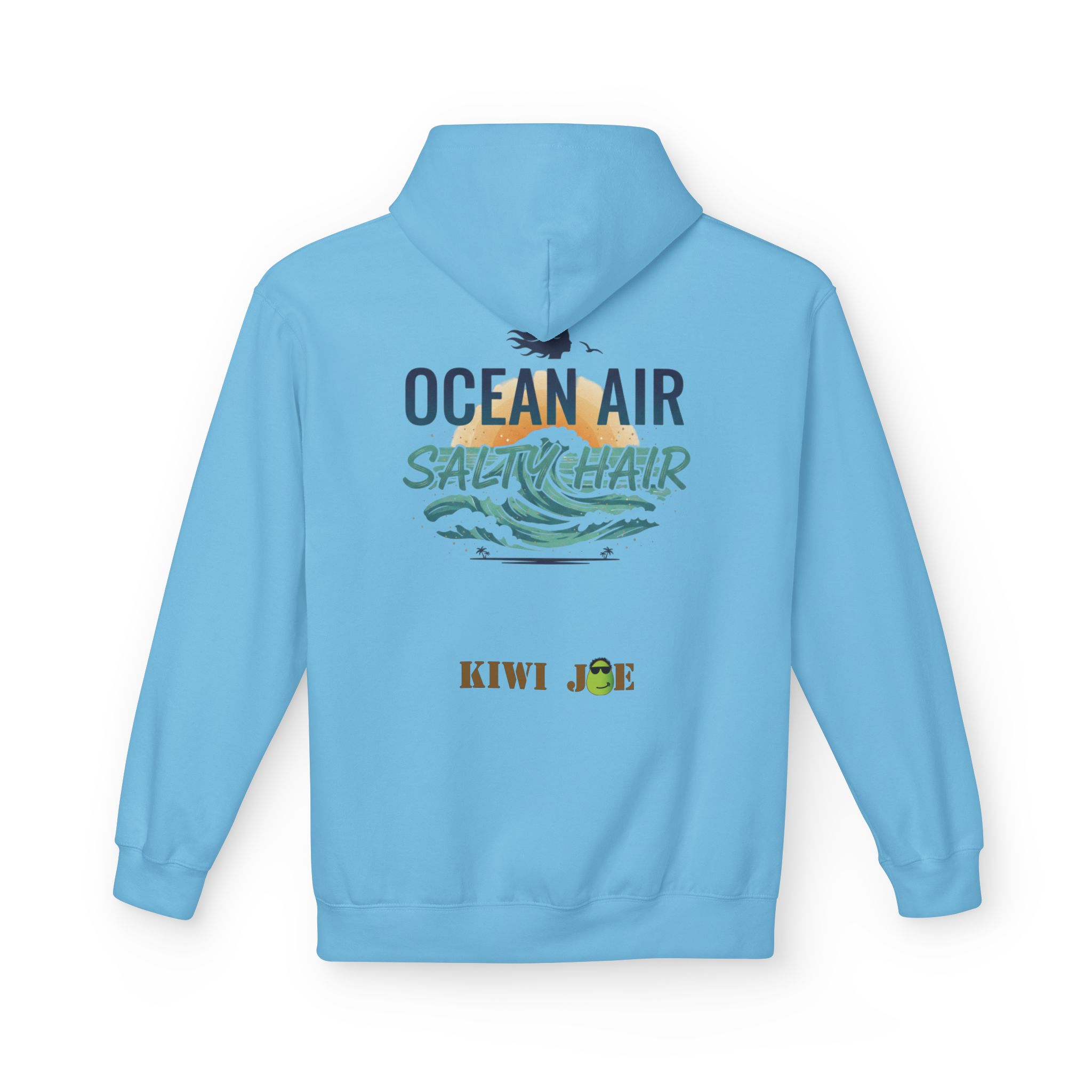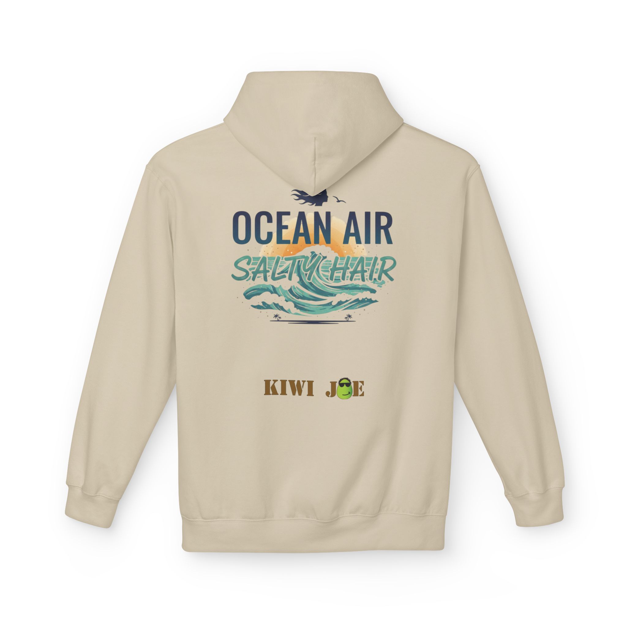 Light, breezy, and a little bit cheeky — this midweight hoodie carries the calm of a salt-sprayed morning and the laid-back grin of a good beach day. A small kiwi-with-sunglasses emblem sits over the heart for low-key charm; the back opens into a sunlit wave and hand-lettered “OCEAN AIR / SALTY HAIR” that reads like a postcard from the shore. The relaxed drop-shoulder cut and roomy pouch pocket make it easy to pull on after a swim or to wear layered for cool coastal evenings. Thoughtful details — a two-piece lined hood, tear-away label, and sustainably sourced fabric — keep it comfortable and responsible, so it feels right to wear while walking the pier, packing the car for a surf trip, or lingering at a bonfire watching the tide roll in.