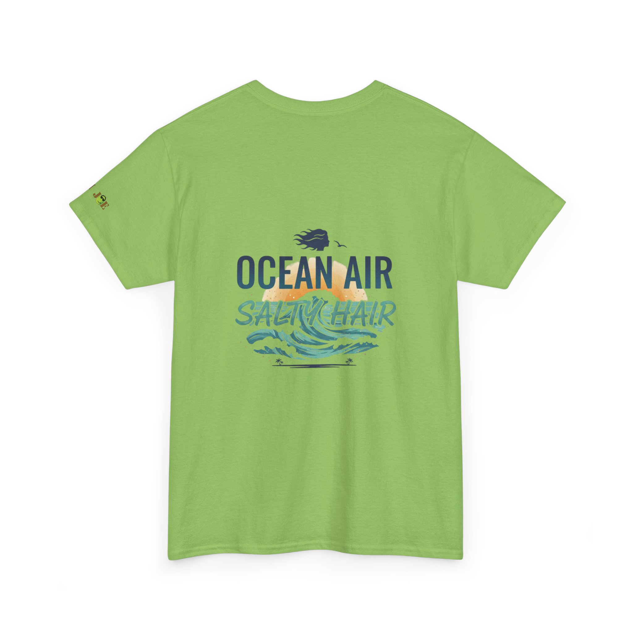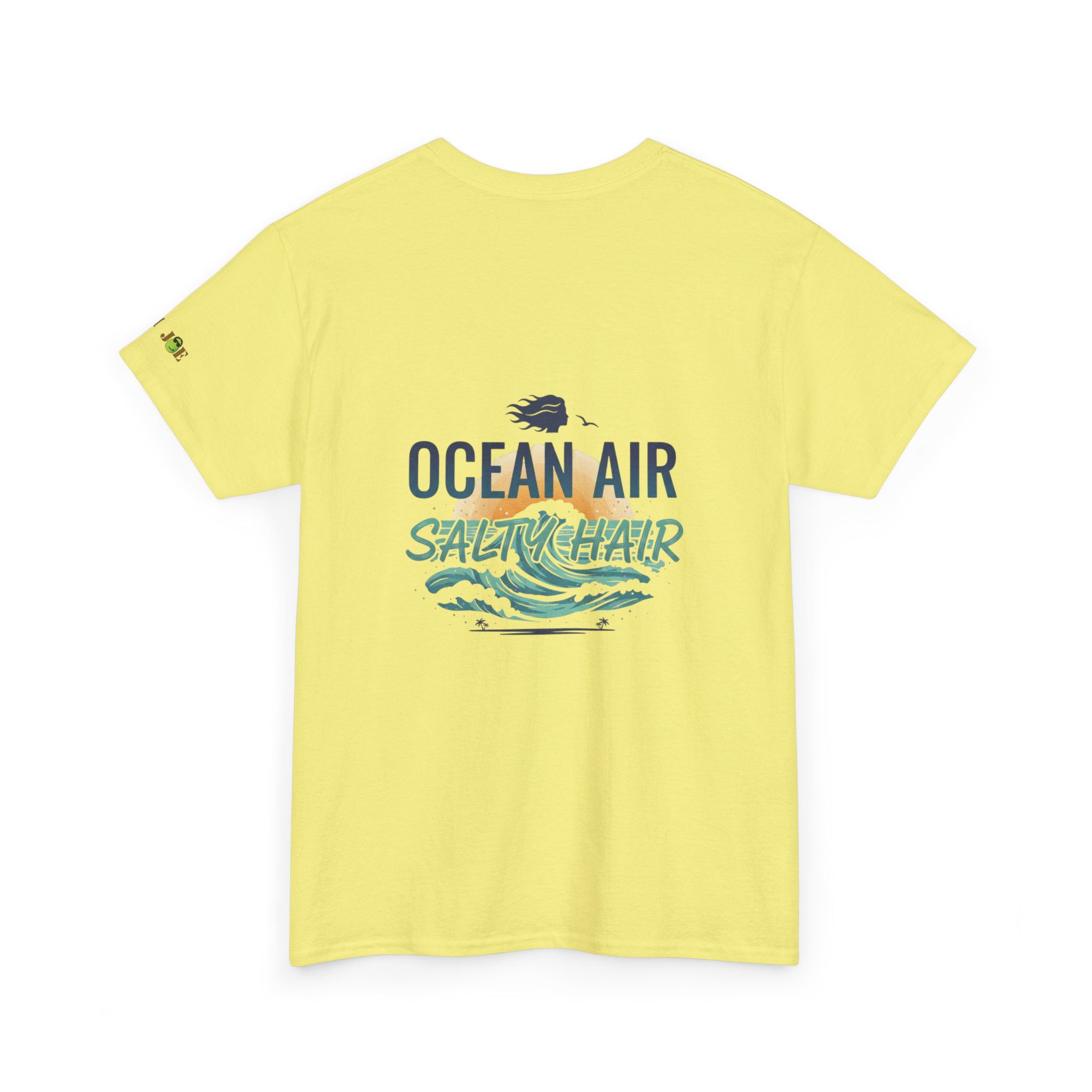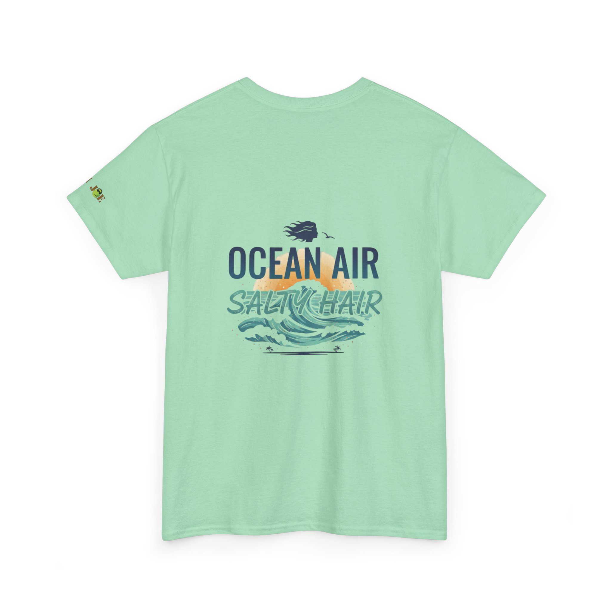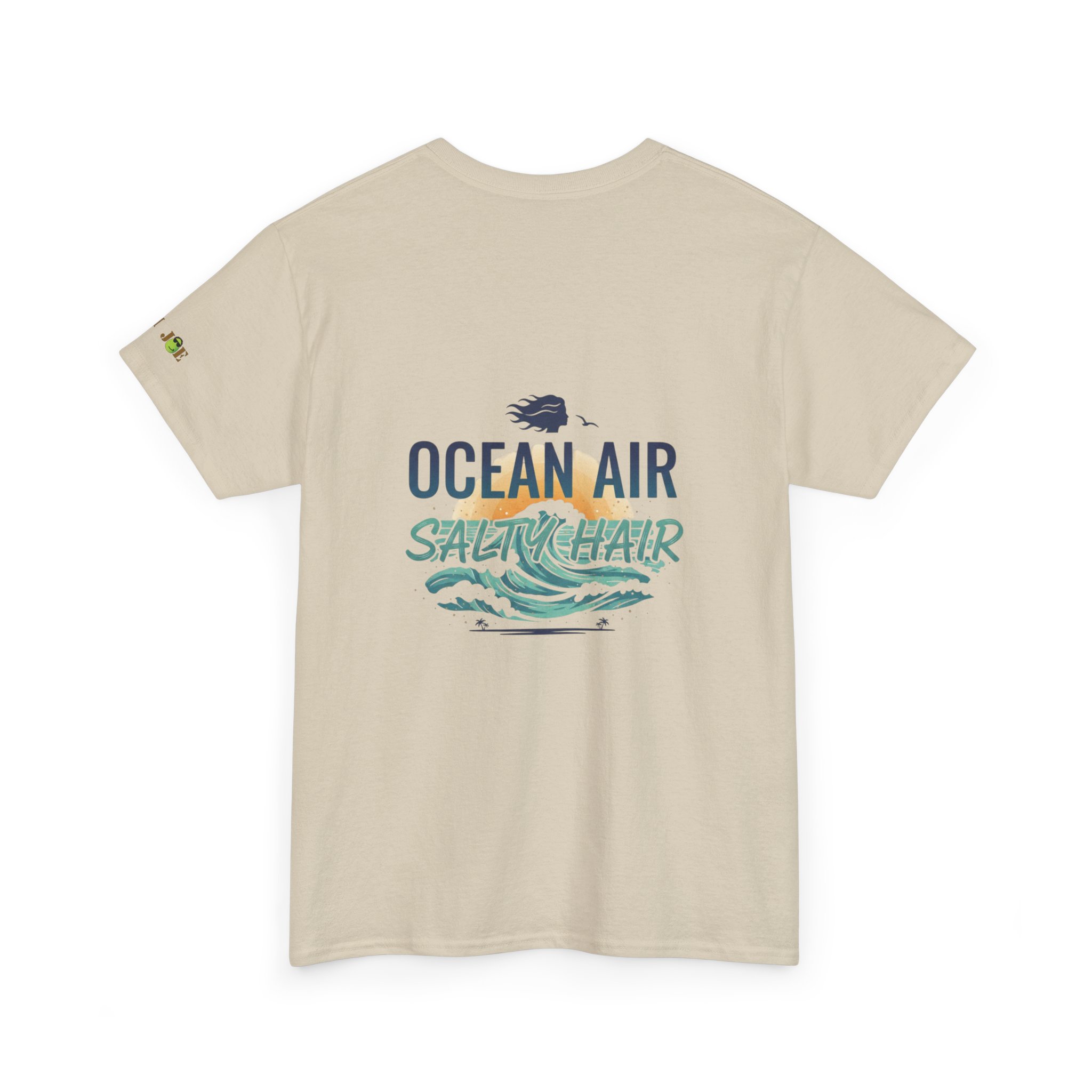 A relaxed, sun-warmed tee that smells like salt on your skin and late-afternoon tides. This soft cotton shirt carries a small, playful crest at the chest and a breezy, watercolor-style back print that reads “OCEAN AIR SALTY HAIR,” with crashing waves and a tiny shell. Wear it after a surf session, on boardwalk walks, or during slow coffee mornings when you still have sand between your toes. The fit is roomy without being sloppy, the collar keeps its shape, and the fabric takes prints beautifully — the design keeps its palette of seafoam greens and deep navy after many washes. Subtle sleeve and inner-neck details add a handcrafted, surf-club feel that slots right into a coastal lifestyle.
