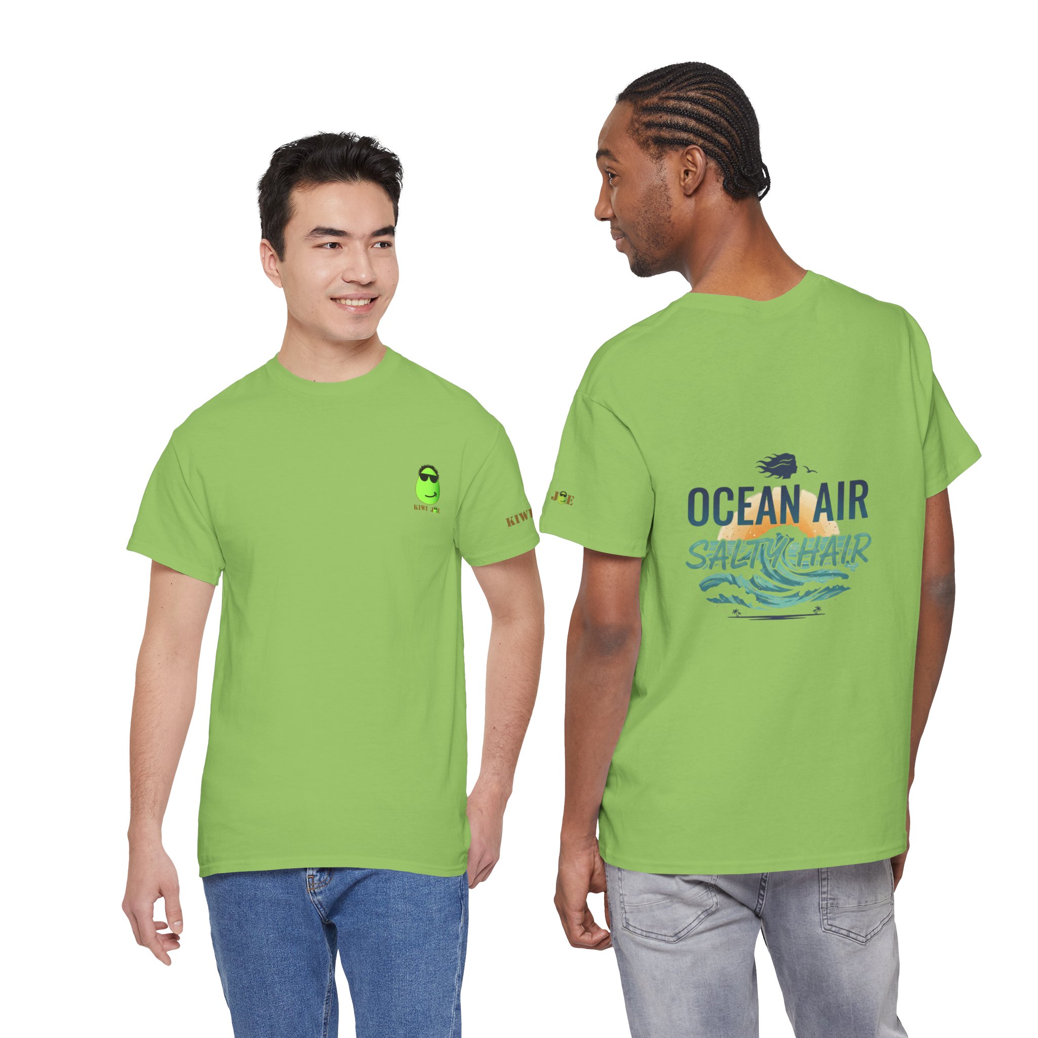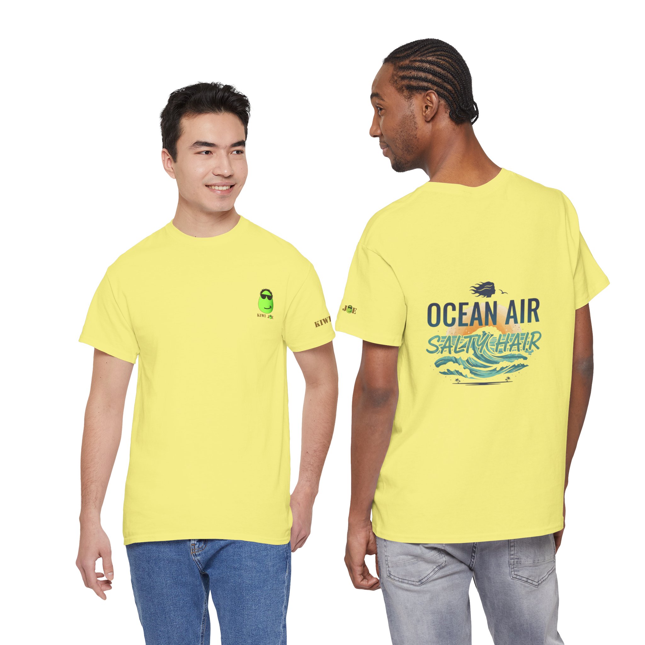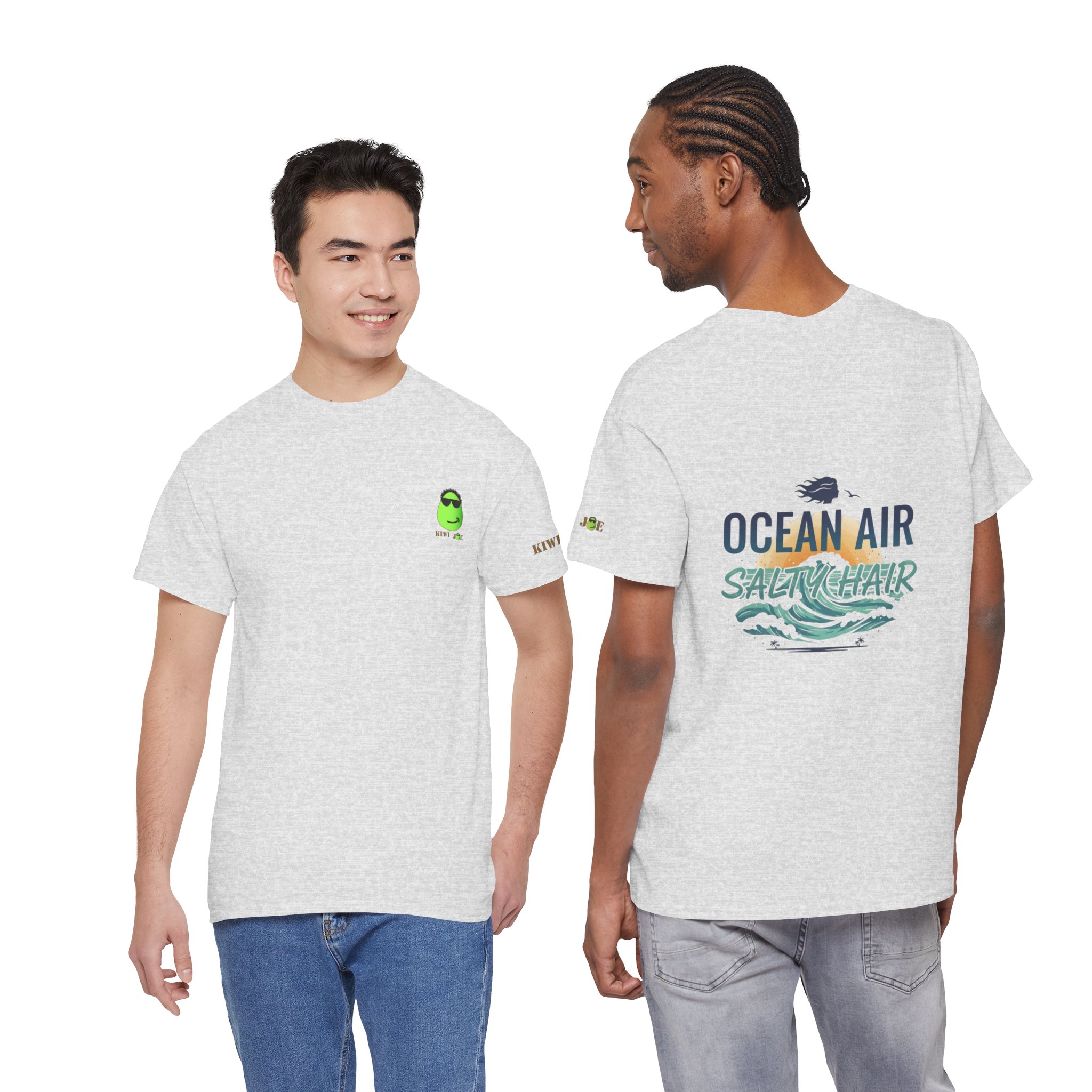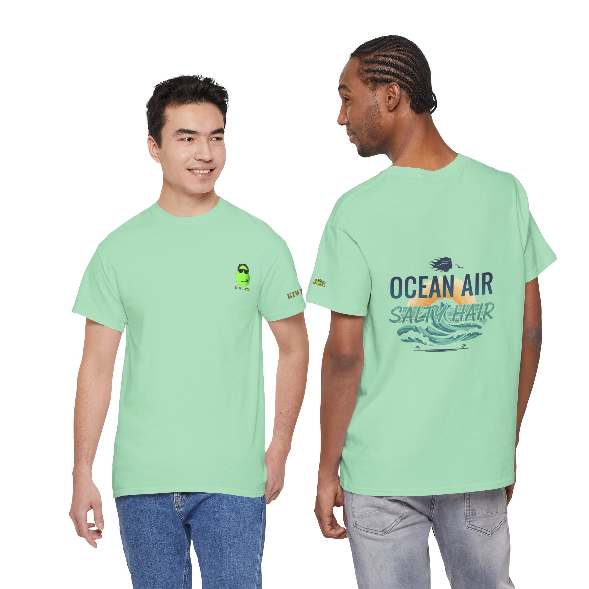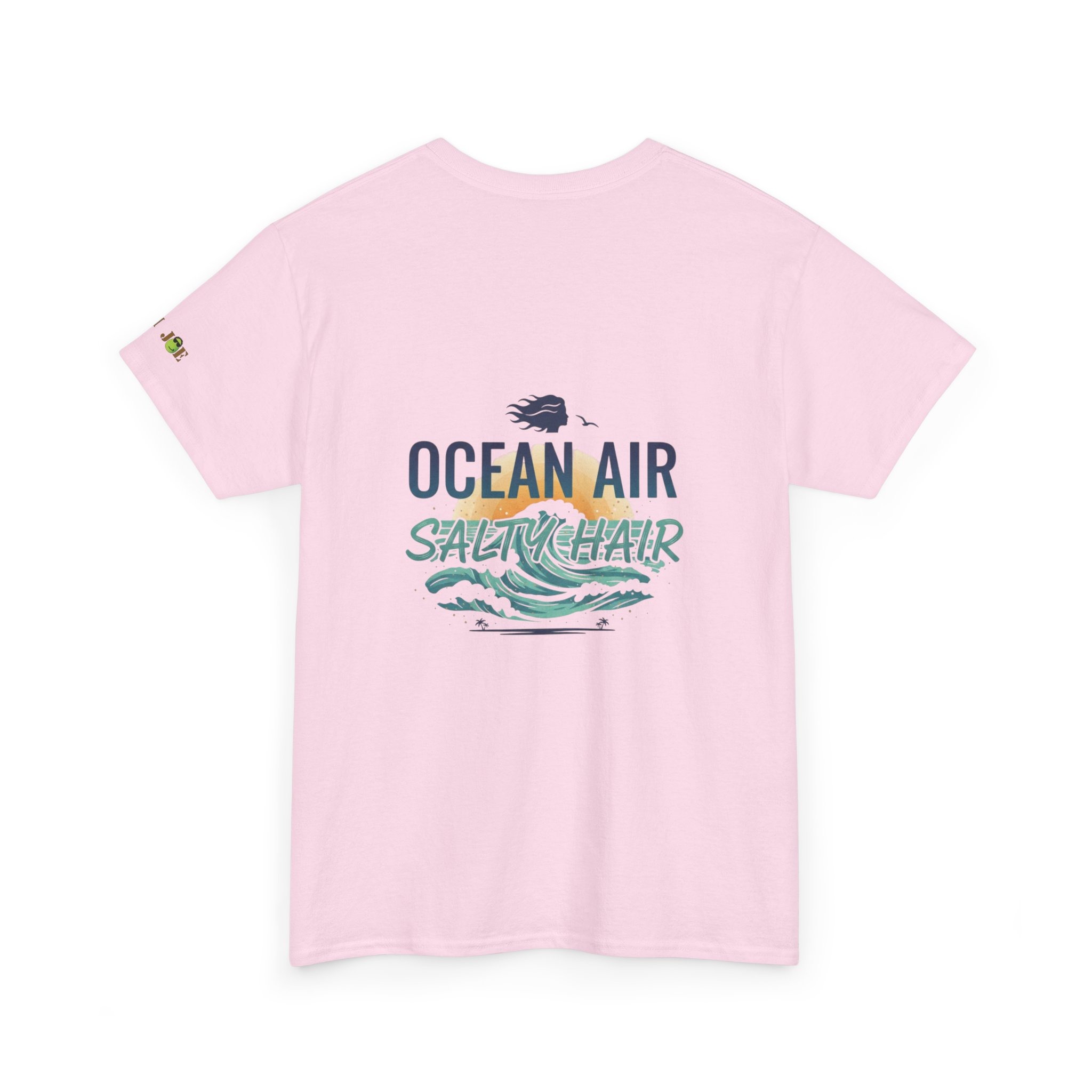 A relaxed, sun-warmed tee that smells like salt on your skin and late-afternoon tides. This soft cotton shirt carries a small, playful crest at the chest and a breezy, watercolor-style back print that reads “OCEAN AIR SALTY HAIR,” with crashing waves and a tiny shell. Wear it after a surf session, on boardwalk walks, or during slow coffee mornings when you still have sand between your toes. The fit is roomy without being sloppy, the collar keeps its shape, and the fabric takes prints beautifully — the design keeps its palette of seafoam greens and deep navy after many washes. Subtle sleeve and inner-neck details add a handcrafted, surf-club feel that slots right into a coastal lifestyle.