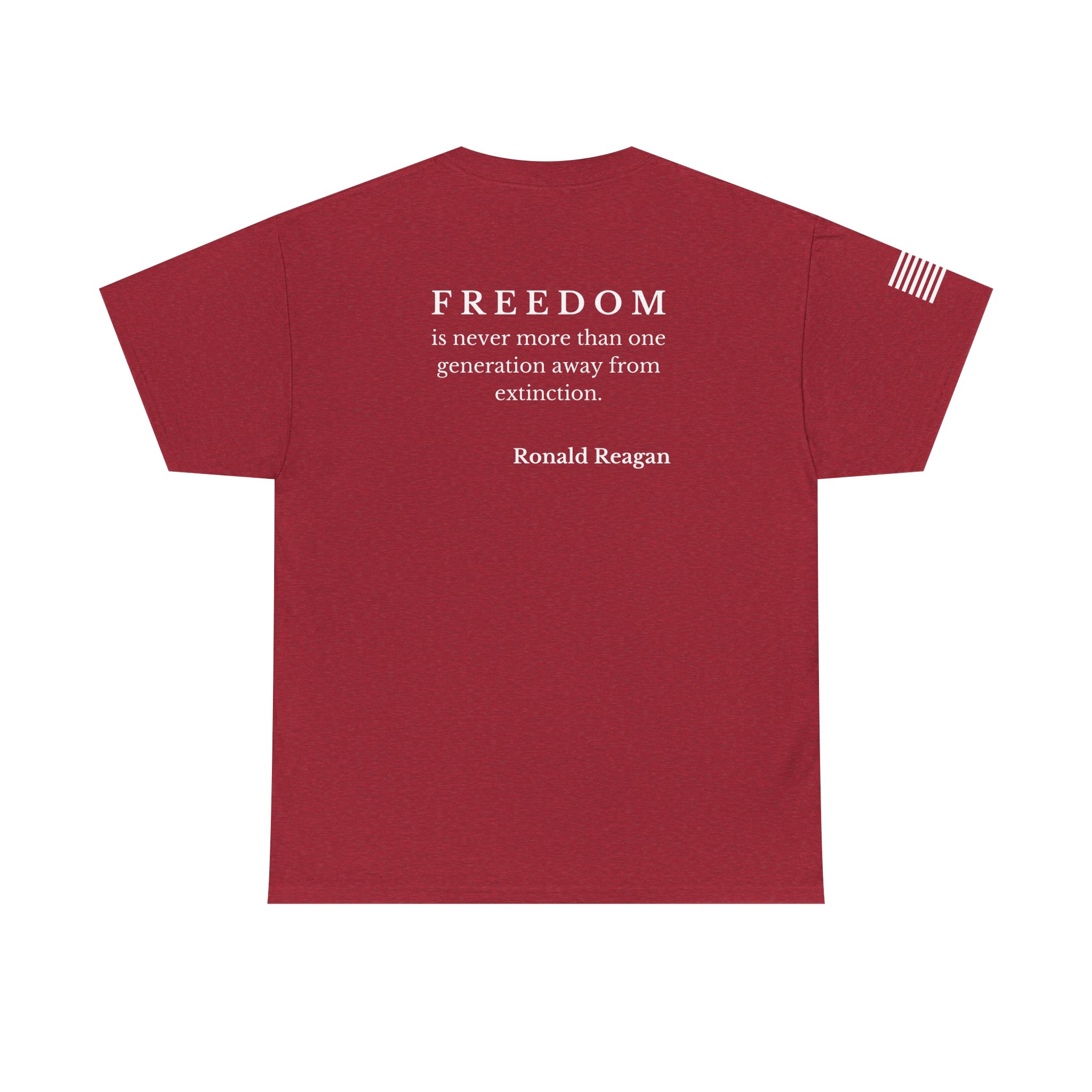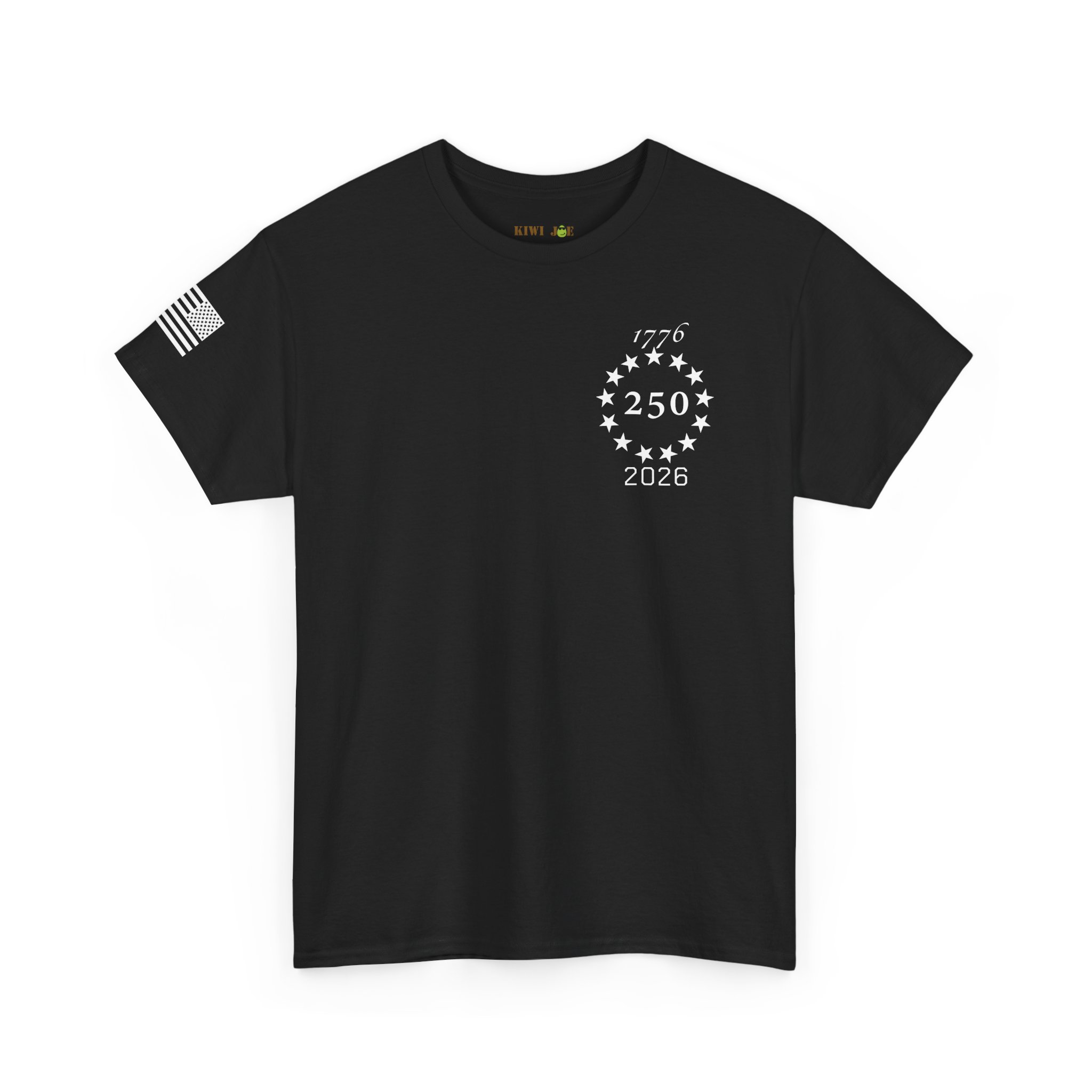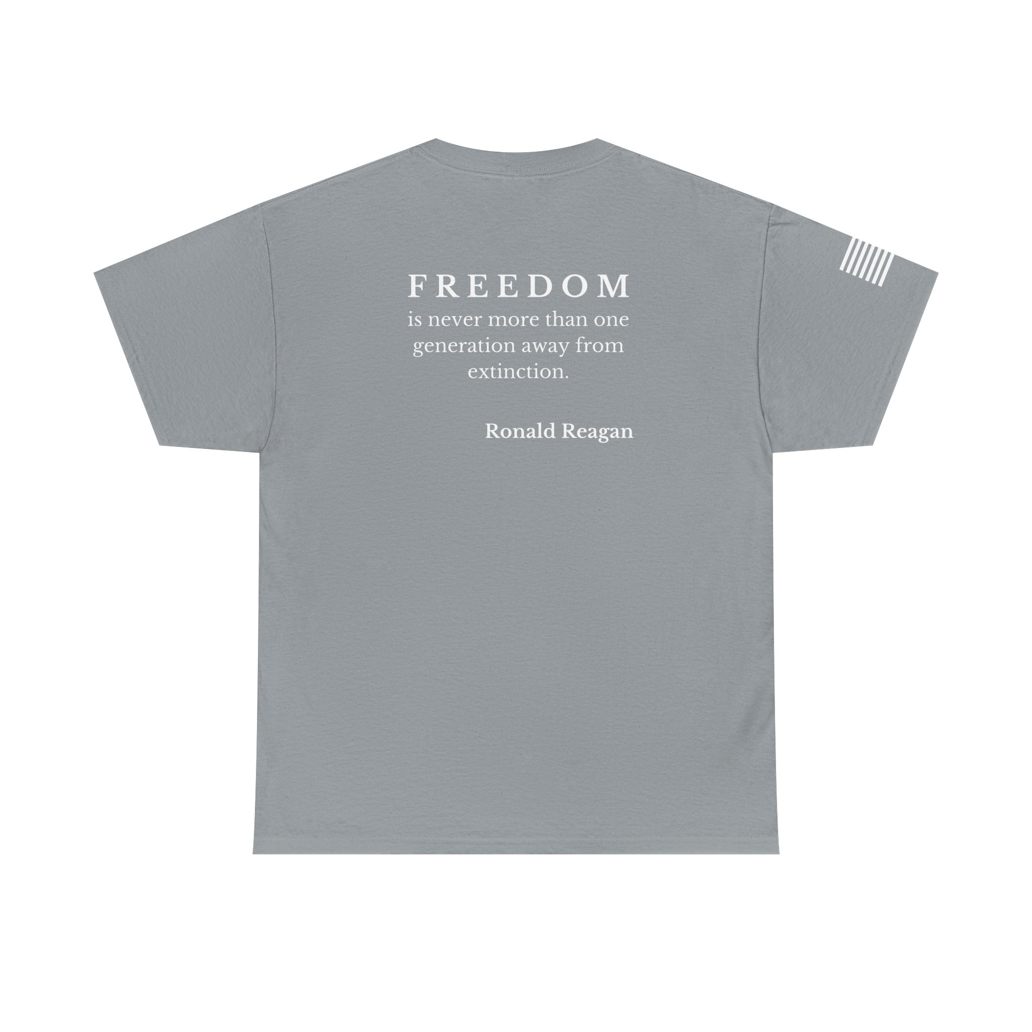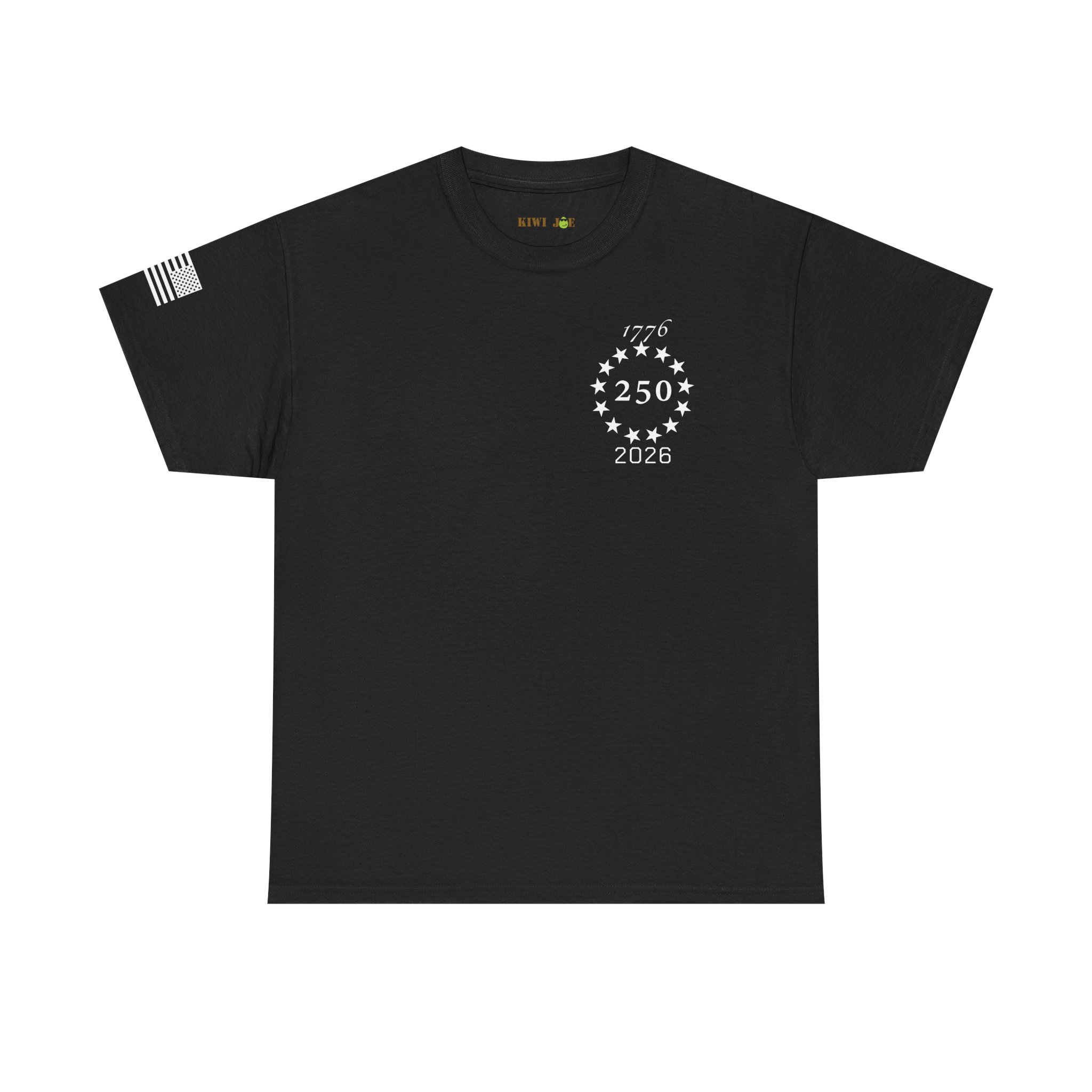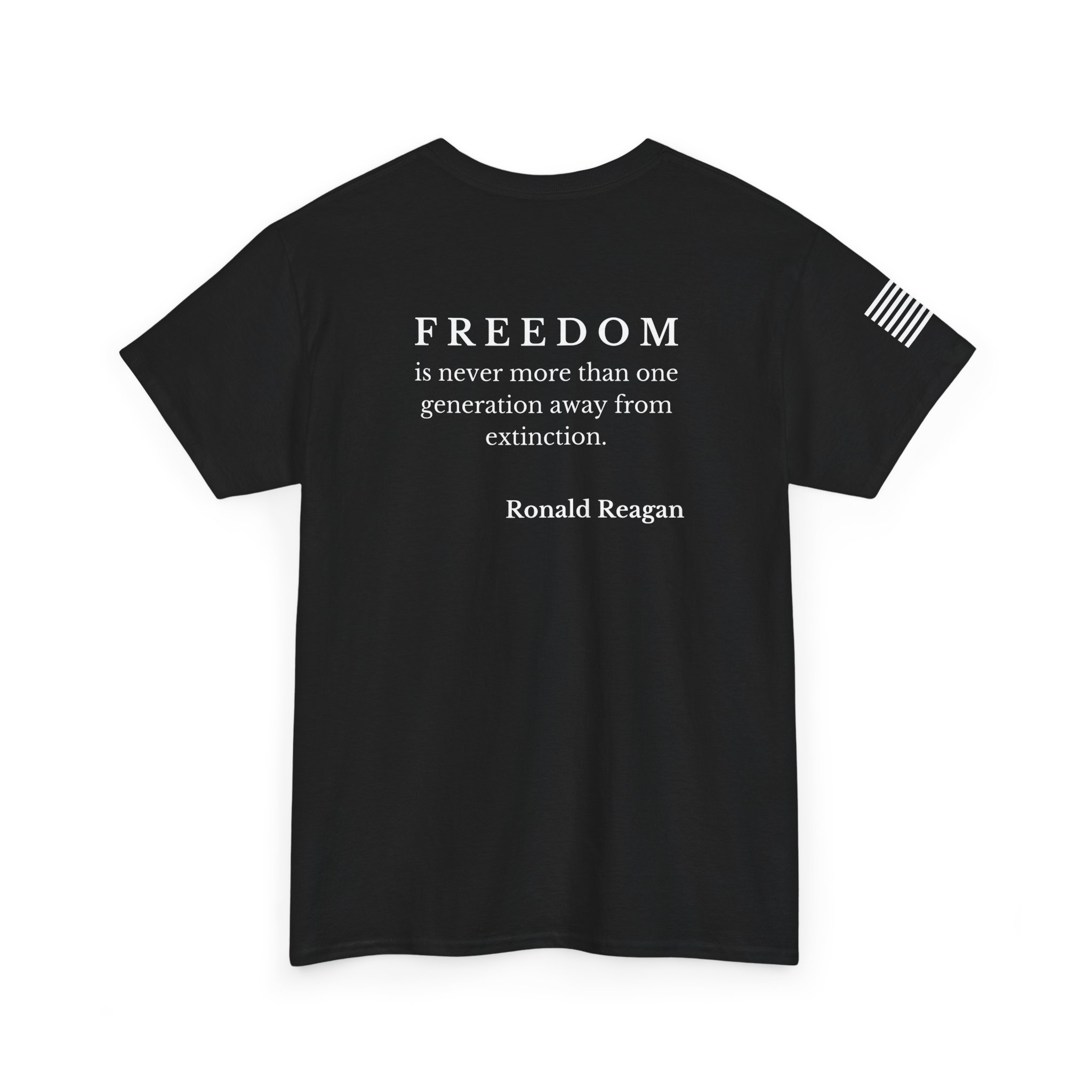 Soft, sturdy tee that wears like a statement. A clean, black crewneck printed with a discreet 250th-anniversary emblem on the chest, a small flag on the sleeve, and a bold quote across the back: “FREEDOM is never more than one generation away from extinction.” It settles into everyday rotation — morning coffee, community events, or evenings at a rally — and speaks quietly but firmly. The fit is relaxed without being boxy. The fabric has enough weight to drape well and hold prints clearly, so the text and emblems stay sharp wash after wash. This shirt feels like something a thoughtful patriot would reach for when they want their values to do the talking.