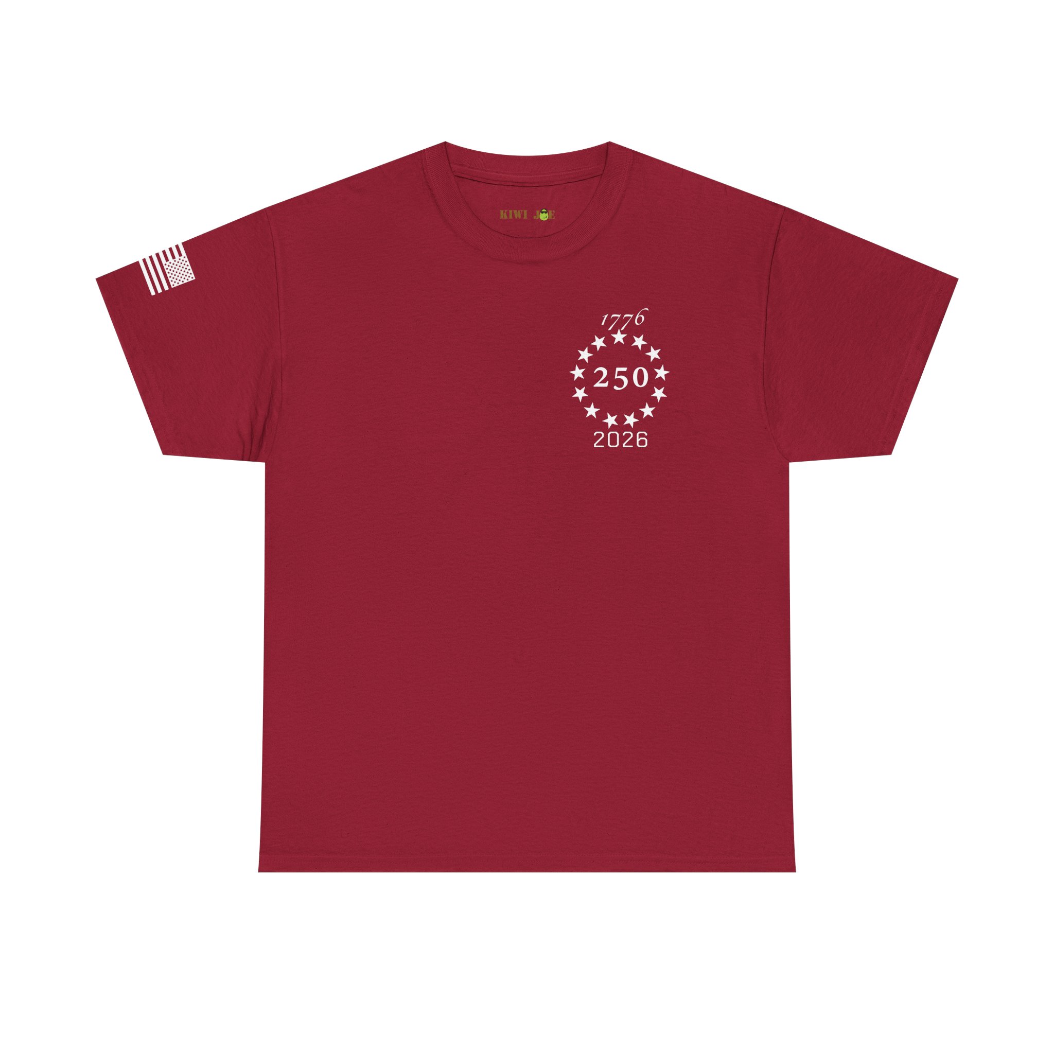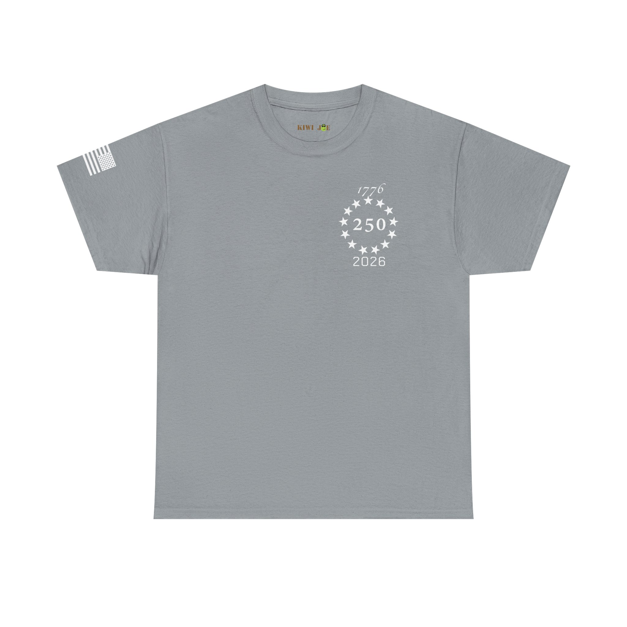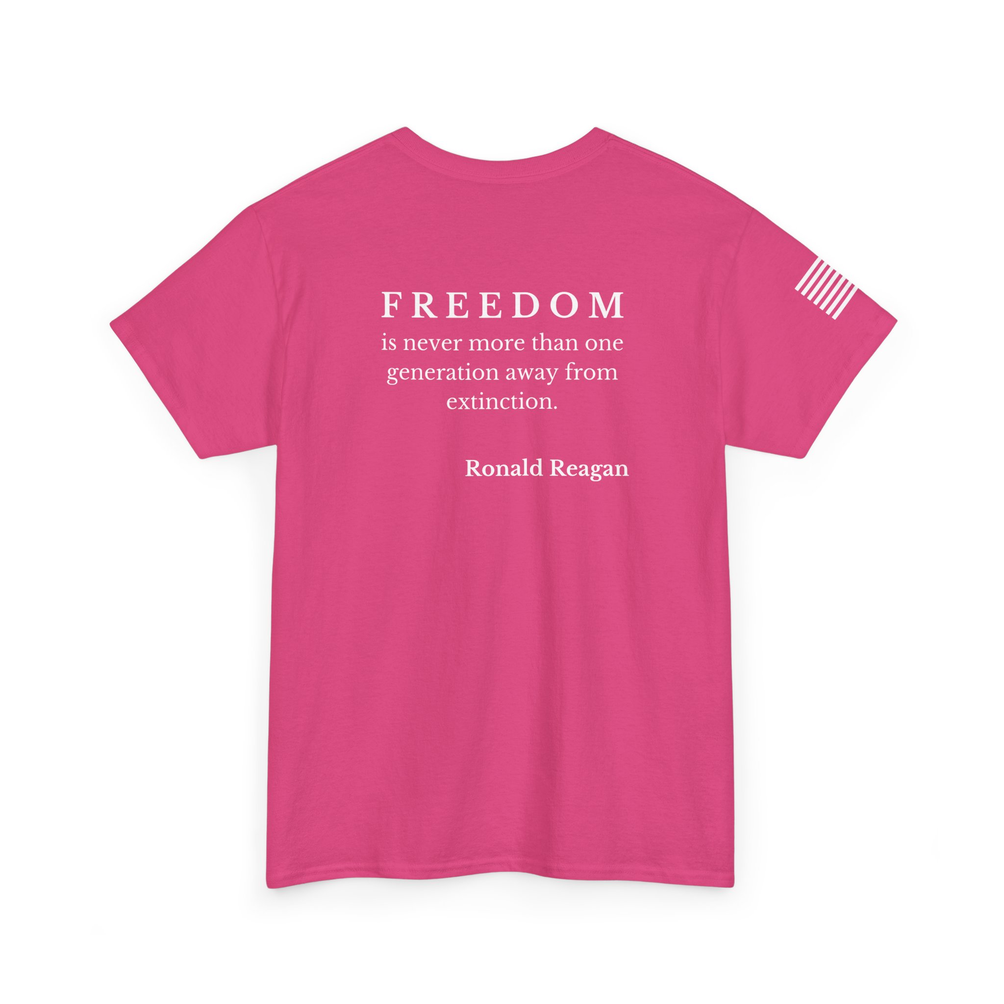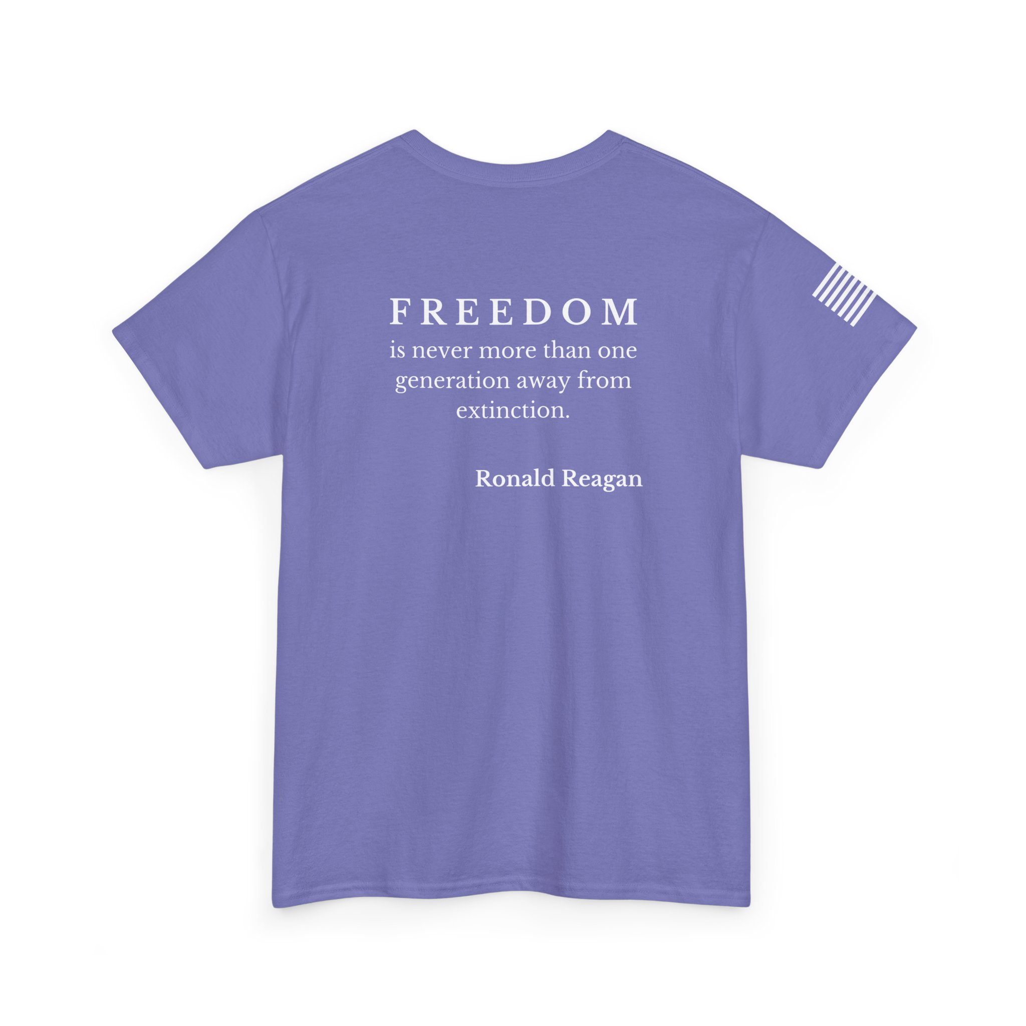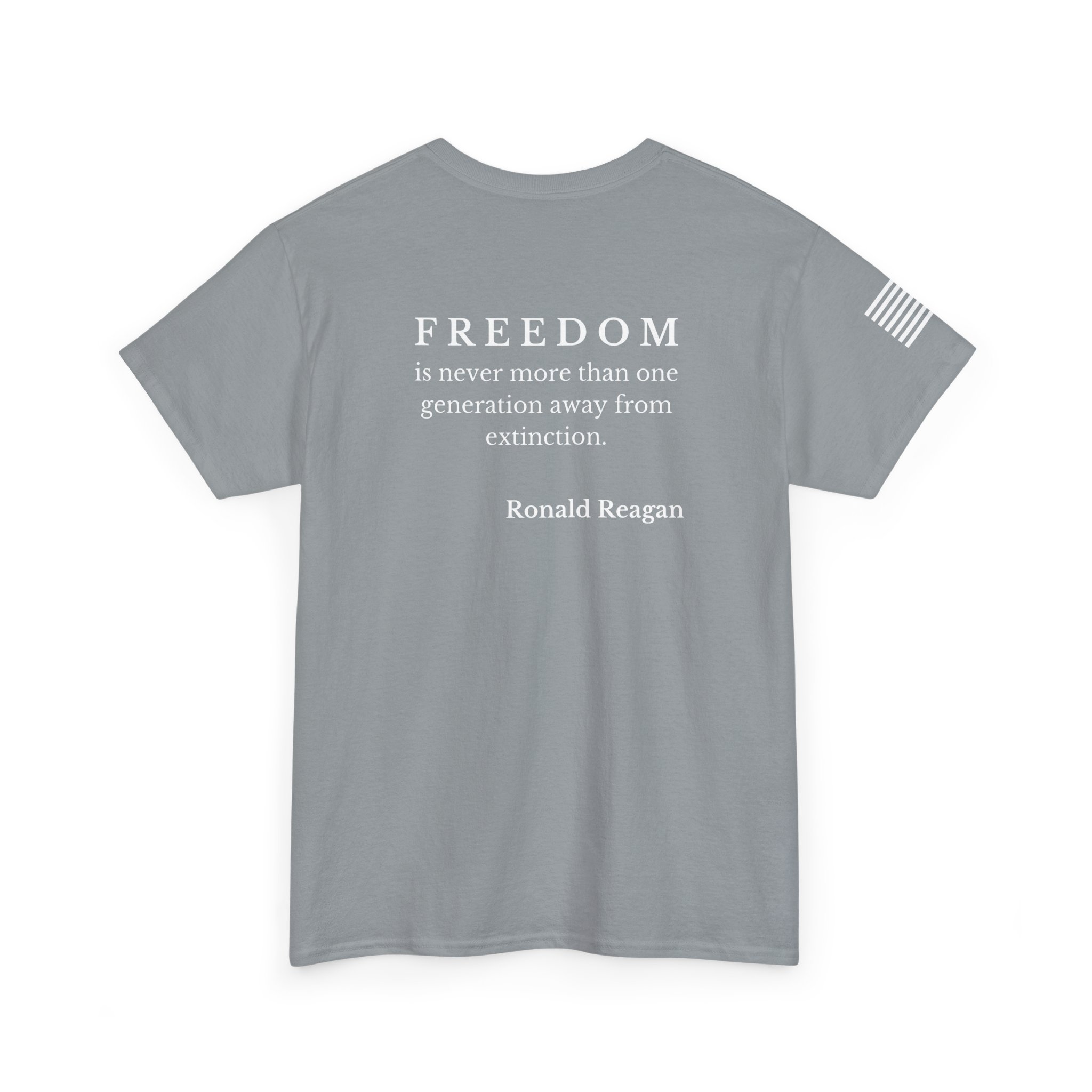 Soft, sturdy tee that wears like a statement. A clean, black crewneck printed with a discreet 250th-anniversary emblem on the chest, a small flag on the sleeve, and a bold quote across the back: “FREEDOM is never more than one generation away from extinction.” It settles into everyday rotation — morning coffee, community events, or evenings at a rally — and speaks quietly but firmly. The fit is relaxed without being boxy. The fabric has enough weight to drape well and hold prints clearly, so the text and emblems stay sharp wash after wash. This shirt feels like something a thoughtful patriot would reach for when they want their values to do the talking.